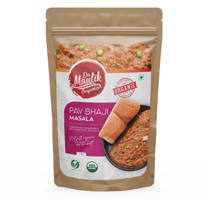 Da Maulik Organic Pav Bhaji Masala is a flavorful and aromatic spice blend made from premium organic ingredients. Perfectly crafted to elevate your pav bhaji, it delivers a rich, tangy, and spicy taste, bringing out the authentic street food flavor. Free from artificial additives, this masala ensures a wholesome, delicious, and healthy meal with every use.